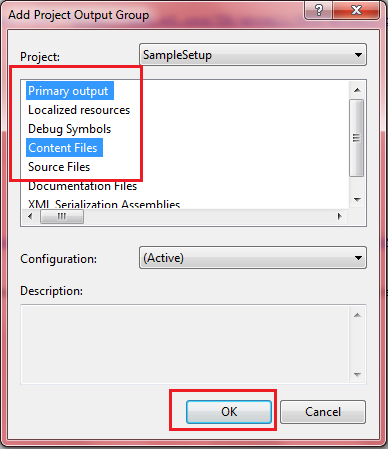 Step6: Once we click on Project Output it will open another window to select required output files in that window select Primary Output, Content Files and click OK